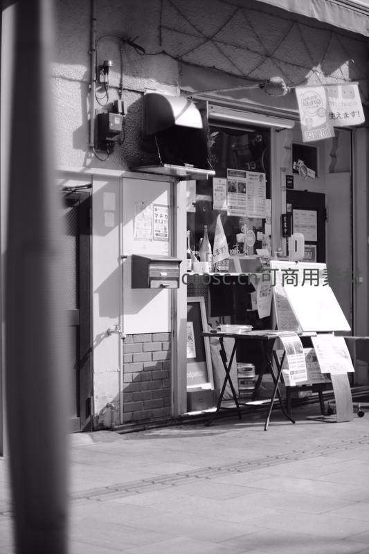 一家日式小店门口摆放着宣传单和折叠桌,阳光洒在墙面上形成明暗对比,黑白色调强化了街角的宁静与生活气息,传递出质朴真实的城市日常。