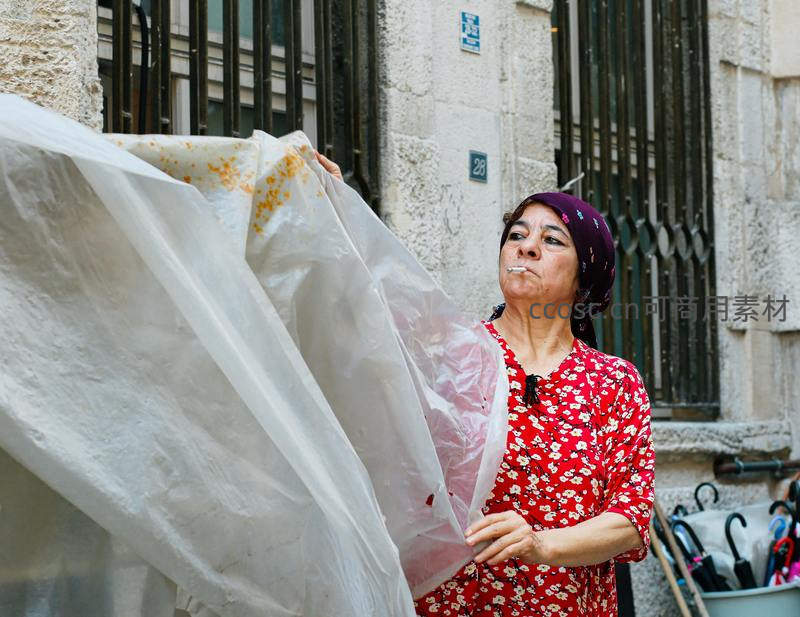 一位戴头巾的妇女在老式建筑前整理透明塑料布,嘴里叼着香烟,神情专注,背景铁窗与门牌号透露出浓厚的生活气息与市井风情。