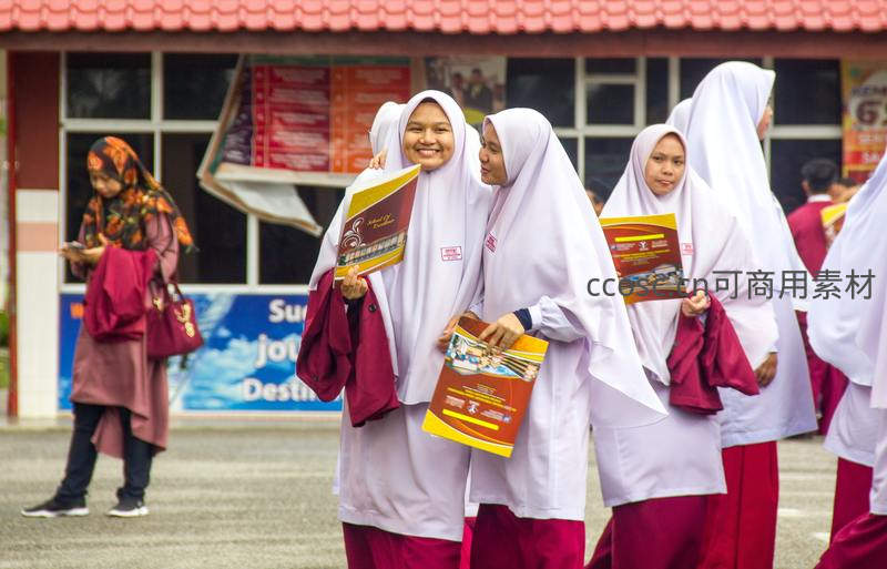 几位身穿白色头巾和红色校服的女学生在校园里愉快地交谈,手中拿着课本和资料,背景是教学楼和宣传栏,充满了青春活力与学习氛围。