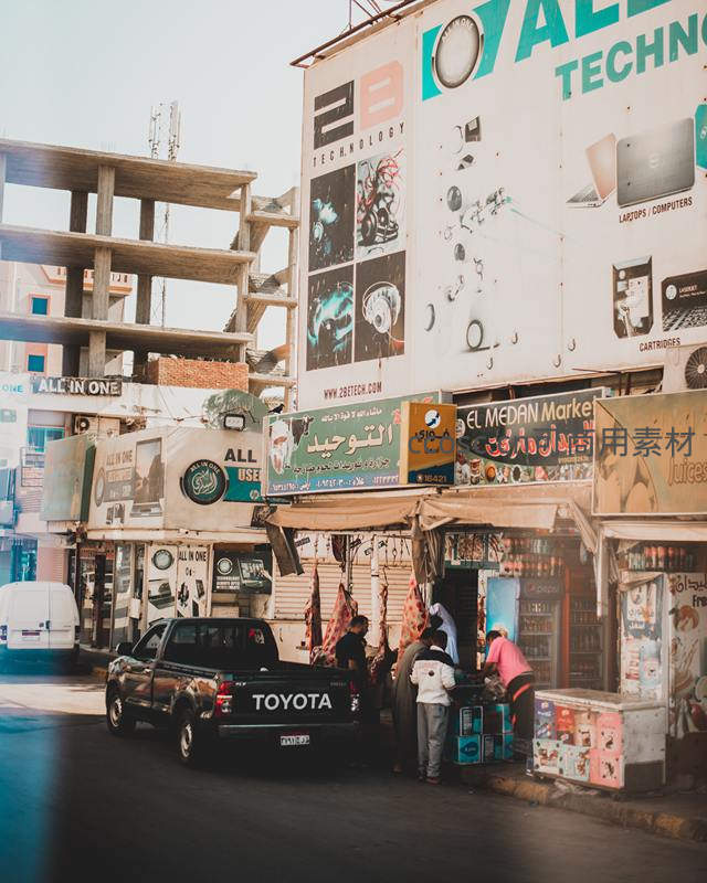 一辆黑色丰田皮卡停在街边店铺前,人们在摊位旁忙碌选购,背景是林立的招牌和未完工的建筑,充满异域市井气息。