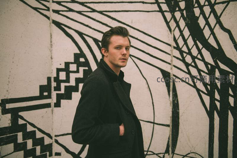 一位身着黑色大衣的年轻男子,姿态随意地站在一面充满几何线条涂鸦的白色墙壁前,眼神专注,整体画面呈现出浓郁的都市时尚感与艺术气息。