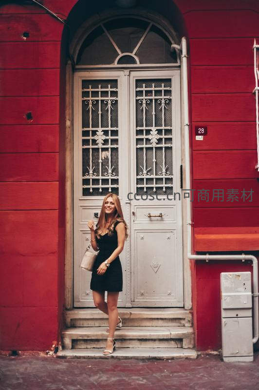 一位金发少女站在鲜艳的红色墙壁和复古白色铁艺门前,身着黑色连衣裙,手提小包,面带微笑,充满活力与艺术感。