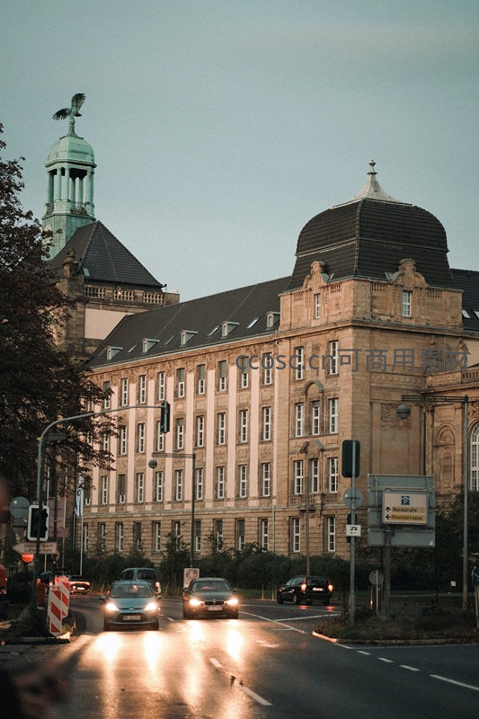 黄昏时分的城市街道,古典风格的市政厅建筑矗立路旁,车灯在湿润路面上反射出温暖光芒,展现欧洲城市傍晚宁静而有序的日常景象。