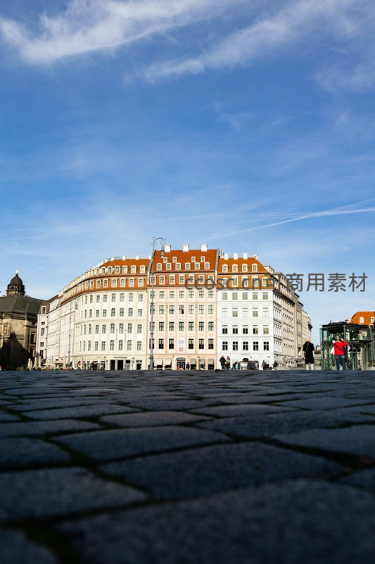 低角度拍摄的石板广场,背景是连绵的欧式古典建筑,红瓦白墙在晴空下格外醒目,行人点缀其间,营造出宁静而富有历史感的城市氛围。