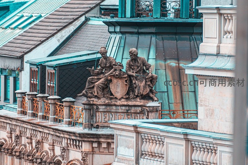 精美的古典建筑屋顶上,两尊人物雕塑守护着盾牌,背景是铜绿斑驳的屋面和精致的铁艺栏杆,展现了浓厚的历史与艺术气息。