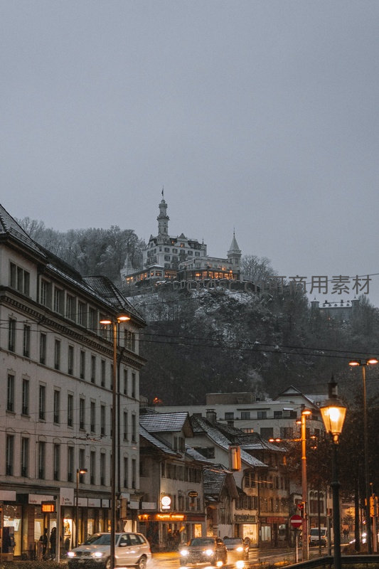 雪花轻覆屋顶,山巅古堡灯火通明,街巷车流穿梭于暖黄路灯下,营造出童话般静谧又温暖的冬日欧洲小镇氛围。