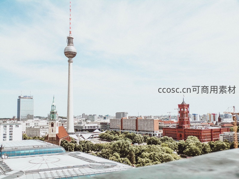 晴空之下,柏林电视塔高耸入云,红色砖墙的市政厅庄重典雅,绿树环绕其间,构成经典而充满活力的城市天际线图景。