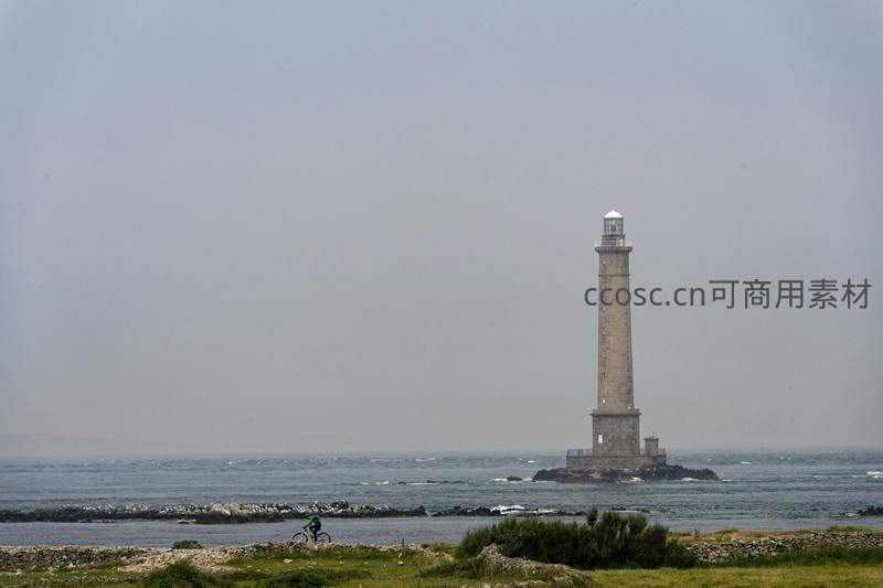 一座高耸的灯塔孤独地伫立于海中礁石之上,远方海天相接,灰蒙蒙的天空下,一名骑行者在岸边小径上缓缓前行,画面充满苍凉与诗意的美感。