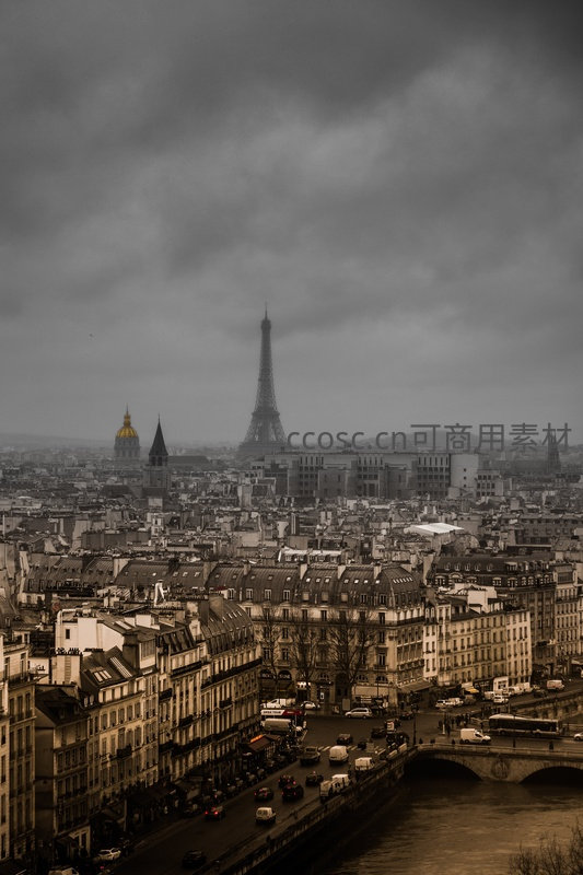 在厚重的乌云下,巴黎的城市天际线尽收眼底,埃菲尔铁塔矗立中央,塞纳河畔车流不息,古典建筑屋顶连绵起伏,营造出静谧而深沉的都市氛围。