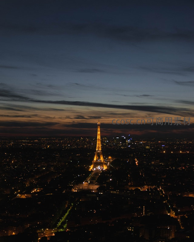 暮色渐浓,埃菲尔铁塔在深蓝与橙黄交织的天幕下亮起温暖灯光,城市逐渐沉入夜色,远处楼宇灯火星星点点,营造出宁静而梦幻的氛围。