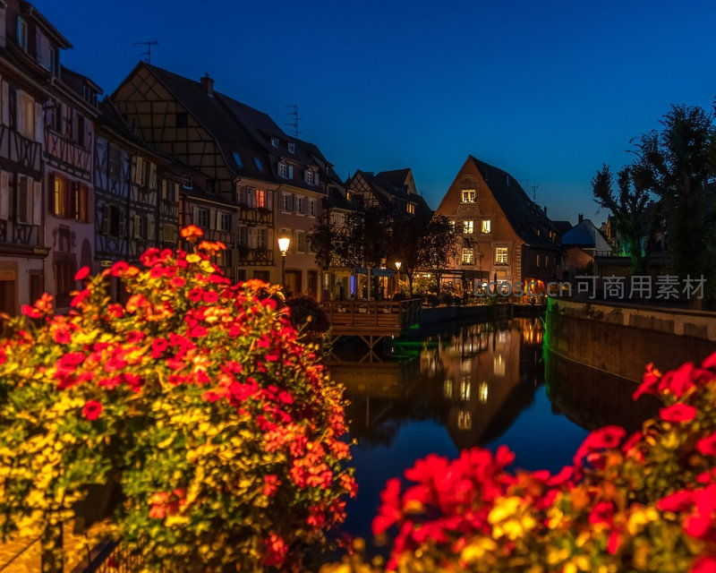 夜色中的花丛与倒影水道