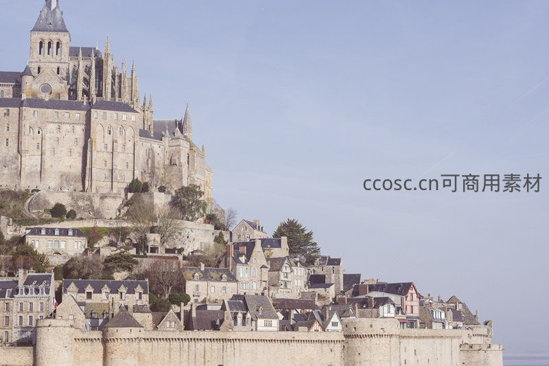 古老的圣米歇尔山修道院雄踞于岩石岛屿之上,层层叠叠的石屋与哥特式尖塔在淡蓝色天空下显得庄严而神秘,是中世纪建筑与自然奇观的完美融合。