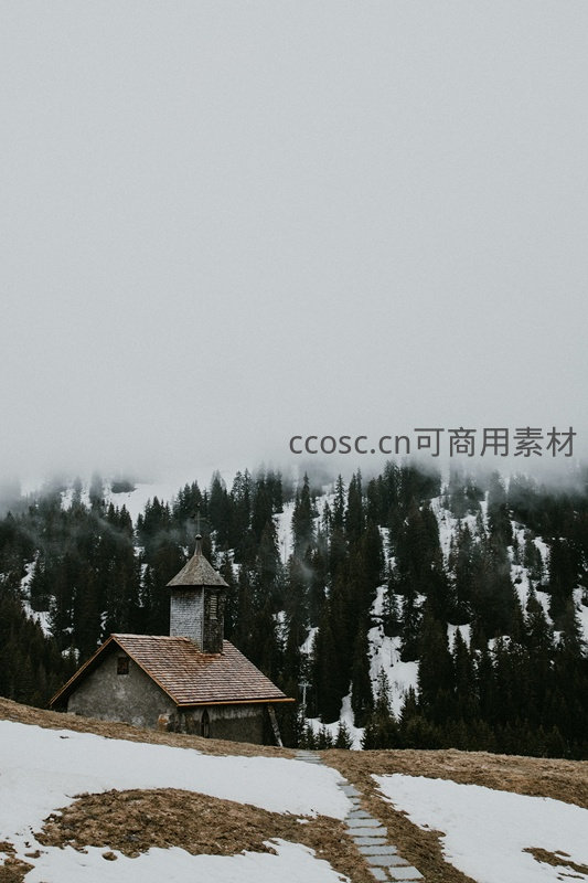 雪山雾霭中的孤寂小教堂