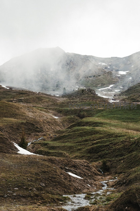 薄雾弥漫在山峦之间,绿意盎然的草甸上蜿蜒着清澈的小溪,残雪点缀其间,营造出宁静而神秘的高原风光。