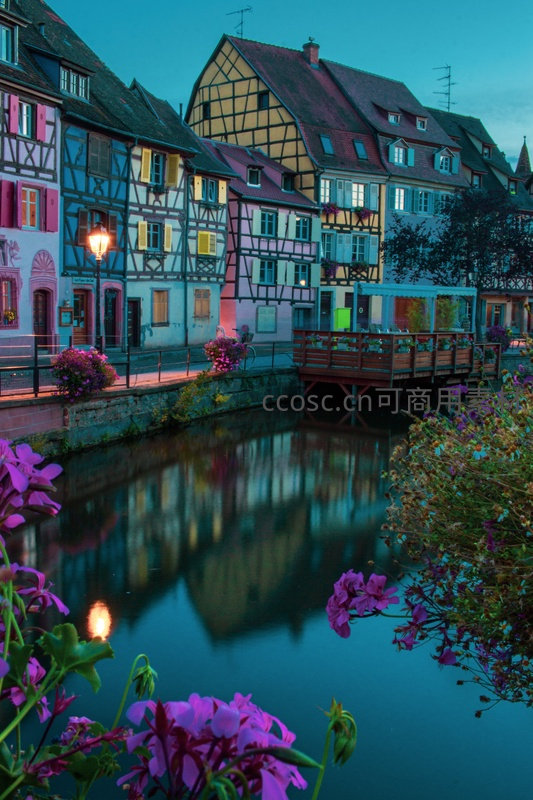 暮色中的彩色木筋房沿河而建,温暖的灯光与水面倒影交织,紫色花朵在前景绽放,构成一幅如梦似幻的欧洲水乡画卷。