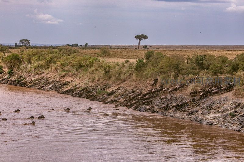 庞大的角马群正沿着陡峭的河岸奔涌而下,冲入浑浊的河流中,激起阵阵水花,生动记录了动物大迁徙中惊心动魄、气势恢宏的一刻。
