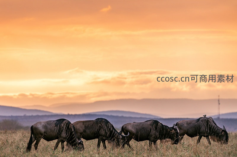 橙红色的夕阳洒满大地,几只角马在草地上低头觅食,身后是朦胧的远山和绚丽的晚霞,营造出温暖而宁静的黄昏氛围。