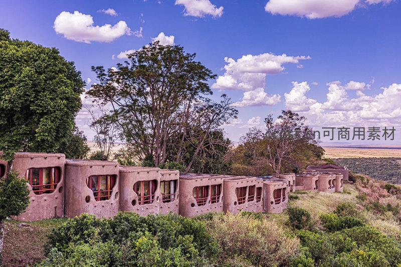 一排造型独特的圆形土坯酒店建筑依山而建,坐落在悬崖边缘,俯瞰着下方广袤的草原,周围绿树环绕,充满异域风情。