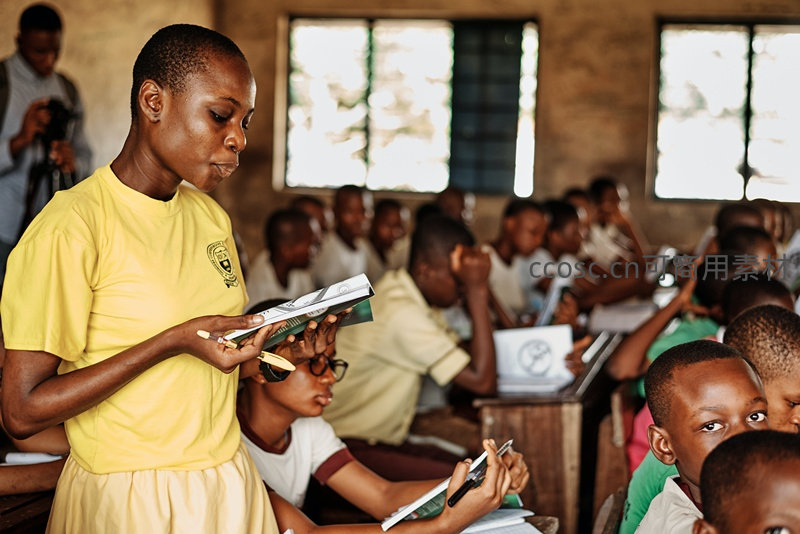 一位身穿黄色校服的女孩站在教室前,认真翻阅课本,周围的同学也聚精会神地记着笔记。这幅画面捕捉了非洲孩子们对知识的渴望与追求。