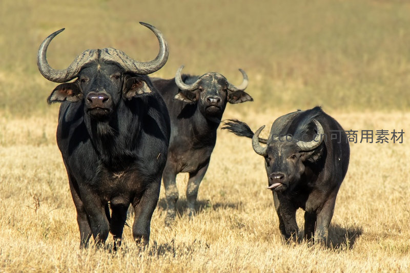 三头健壮的非洲水牛在金黄色的草原上阔步前行,巨大的弯角和黝黑的皮毛彰显着野性力量,背景是无垠的原野。