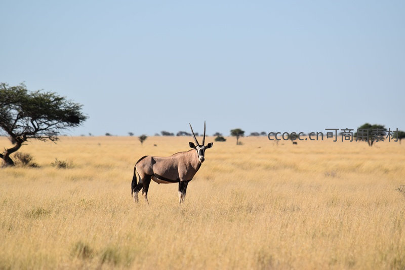 一只雄壮的大羚羊独自伫立于无垠金黄草原之上,背景是清澈蓝天与稀疏孤树,尽显荒野王者的孤独与优雅风姿。