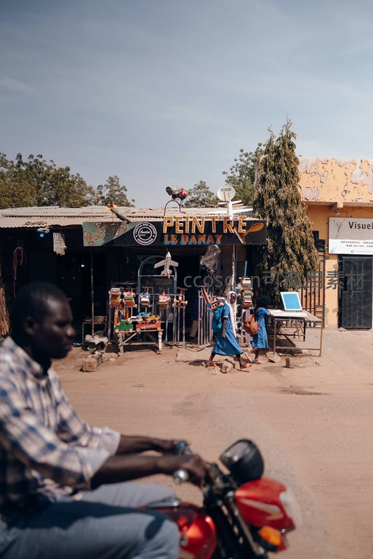 在阳光明媚的非洲小镇,一名男子骑着摩托车经过一家名为“PEINTRE LE DAKAY”的画家店铺,两名穿校服的女孩从店前走过,展现了当地充满活力的日常生活。