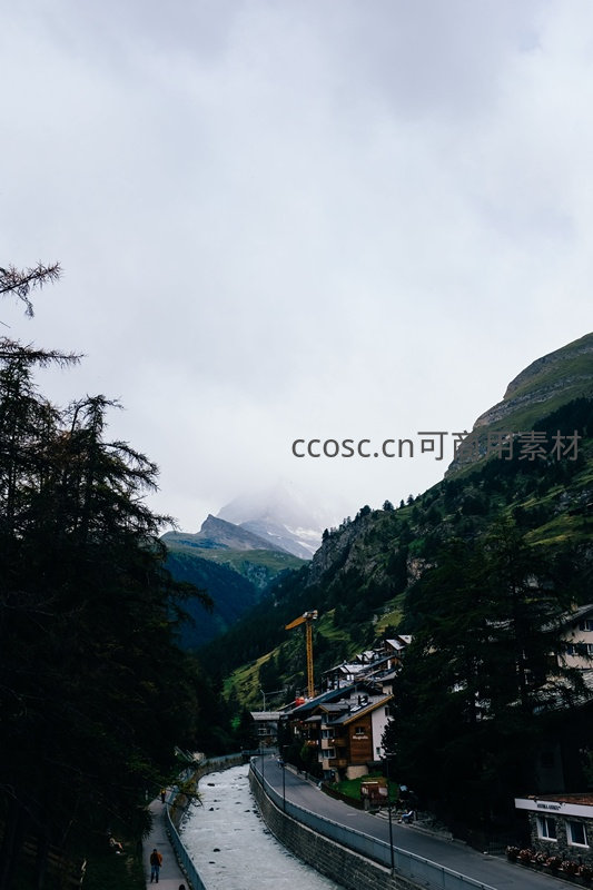 一条清澈溪流蜿蜒穿过宁静的山谷小镇,两旁是典型的木屋建筑。远处的雪山在厚重云层中若隐若现,为这幅田园山水画增添了一丝神秘与壮阔。