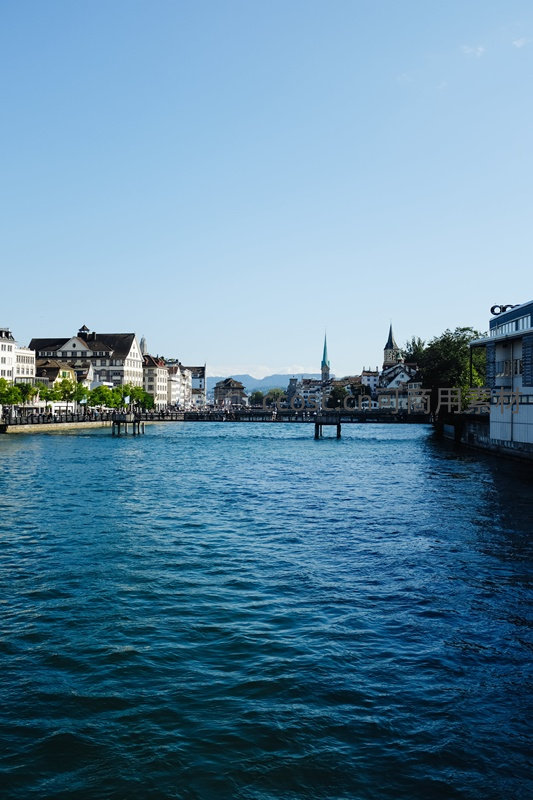 清澈的河水在阳光下波光粼粼,两岸是保存完好的欧式古典建筑,远处教堂尖塔直指蓝天,构成一幅宁静而富有历史韵味的城市画卷。