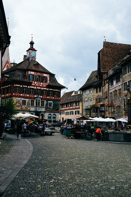 古老的鹅卵石广场上摆满了白色遮阳伞下的摊位,背景是色彩斑斓的木筋墙房屋和高耸的钟楼,充满浓郁的欧洲小镇生活气息。