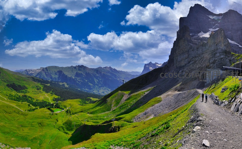 晴空万里,洁白云朵点缀蔚蓝天空,两位旅人漫步在崎岖山径上,远眺连绵起伏的青翠山峦与雄伟岩壁,尽享自然之壮美。