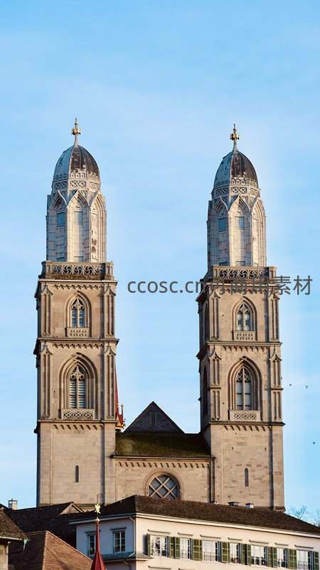 两座高耸的哥特式教堂尖塔在晴朗蓝天下显得格外庄严,石质结构细节丰富,是城市天际线的标志性景观。