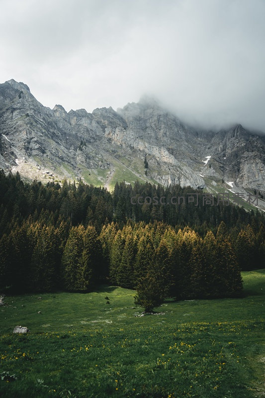 雄伟的灰色山峦被低垂云雾轻柔环绕,山脚下茂密的针叶林与翠绿草甸相接,点缀着零星野花,呈现出原始而宁静的高山生态美景。