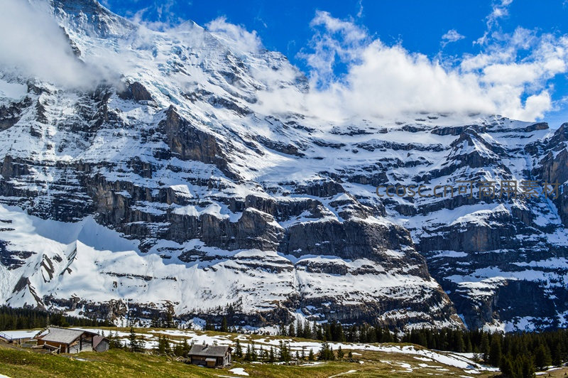 巨大的雪峰在蓝天白云下巍然耸立,层层叠叠的岩壁被冰雪覆盖,山脚稀疏分布着几座木屋,云雾时而缭绕峰顶,展现出高海拔地区原始而震撼的自然力量。