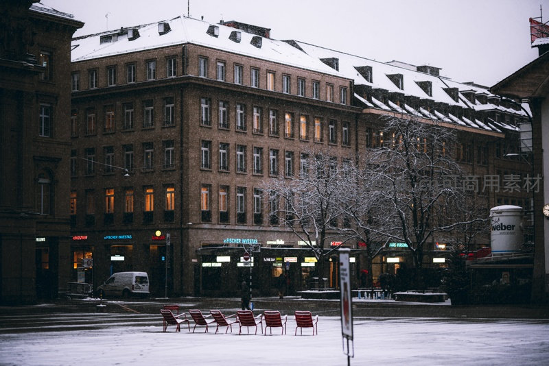 冬日傍晚雪花纷飞,欧洲老城广场空旷宁静,积雪覆盖地面与屋顶;暖黄色灯光从砖石建筑窗户透出,红色金属座椅整齐排列,远处店铺霓虹微亮,营造出冷暖交织的诗意氛围。