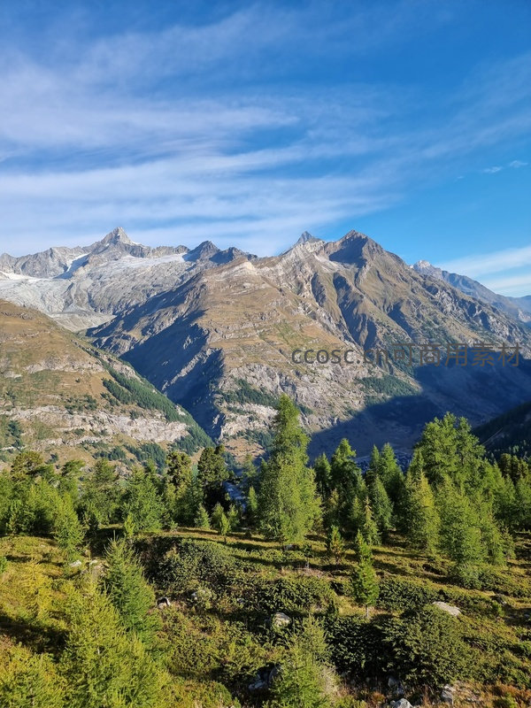 晴朗白昼,强烈日照照亮连绵锯齿状雪峰与裸露岩壁,部分冰川残存于谷底;前景为茂密松林与低矮灌木覆盖的缓坡,光影交错,空气通透,尽显阿尔卑斯高山生态系统原始壮美与宁静。