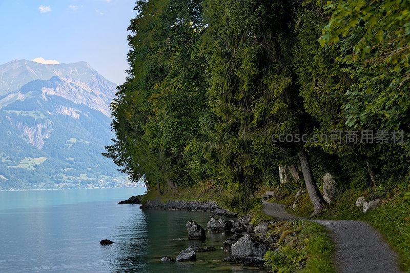 清澈湖水映衬着青翠山峦,林荫小径沿岸蜿蜒,岩石点缀水边,阳光透过树叶洒落,展现阿尔卑斯山区典型的静谧自然美景。