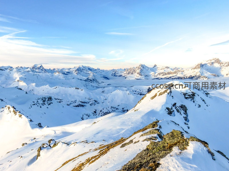 高角度航拍视角展现连绵起伏的阿尔卑斯雪山,山峰被厚雪覆盖,阳光斜照在雪脊上泛出金辉,中景云海如絮漂浮于谷底,前景裸露岩脊点缀枯草,天空湛蓝澄澈,呈现极致冬日山野壮美景象。