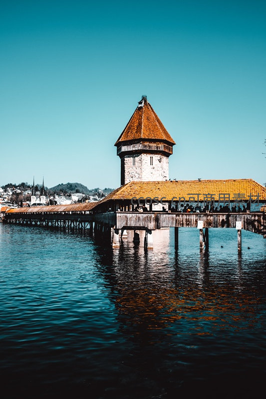 卢塞恩卡佩尔廊桥与八角水塔倒影,碧空如洗的瑞士湖畔风光