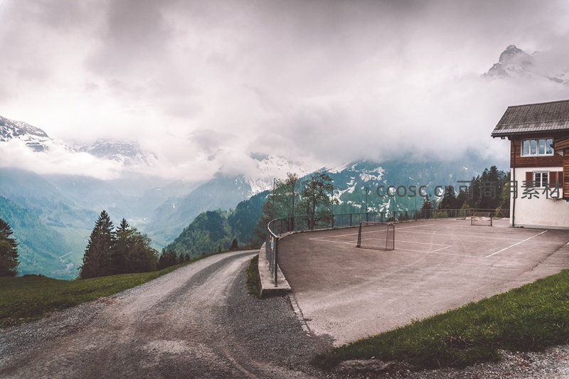 云雾缭绕高山网球场,阿尔卑斯山麓静谧小屋景致