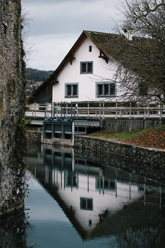 阴天下的狭窄运河如镜面般映出白墙灰瓦的百年民居与木质廊桥;左侧斑驳石墙诉说时光痕迹,枯枝轻拂水面,整体氛围沉静内敛,呈现瑞士传统水乡小镇的古典韵味与诗意留白。