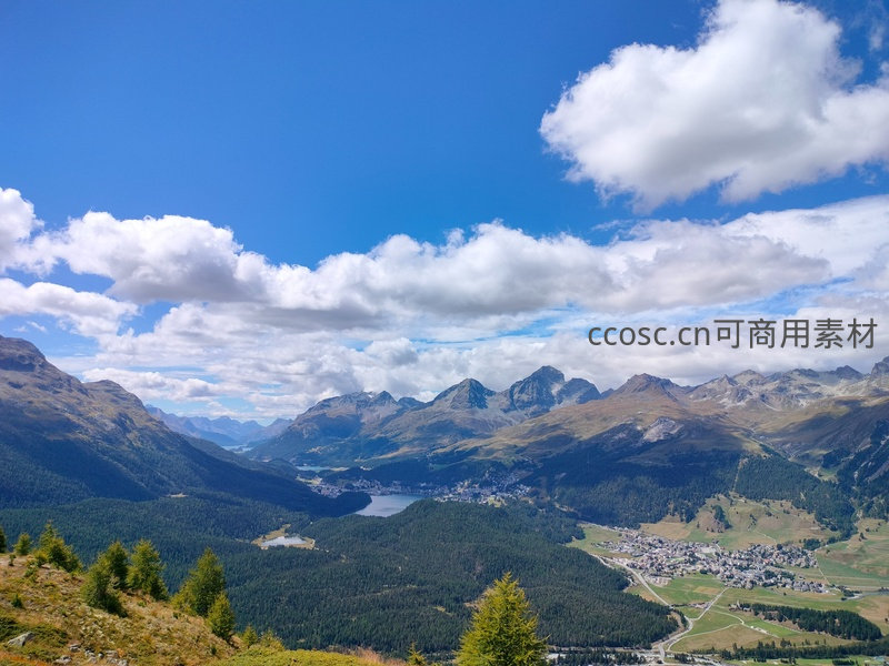高角度俯瞰阿尔卑斯山谷,蓝天白云下群峰连绵,谷底小镇星罗棋布,河流蜿蜒穿行于茂密针叶林间,光影层次丰富,展现高山生态系统的恢弘与和谐。