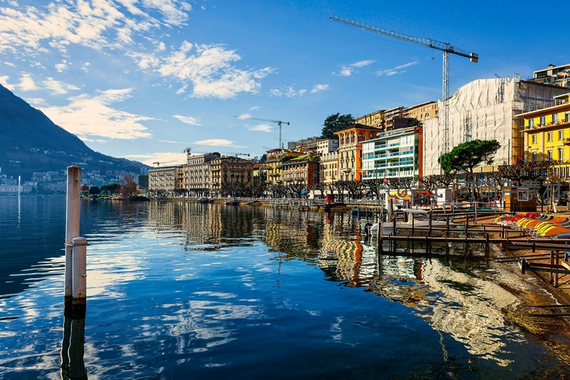 晴空下,湖面如镜映照沿岸新旧交融的建筑群:历史风格楼宇与现代玻璃幕墙并存;高耸塔吊正在施工,彰显城市发展活力;木质码头、彩色小艇点缀水边,展现欧洲湖城动态与静美的和谐共生。