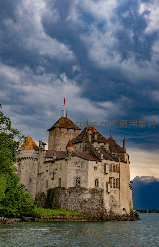 奇隆城堡雄踞湖心岛,乌云密布下红旗飘扬显庄严
