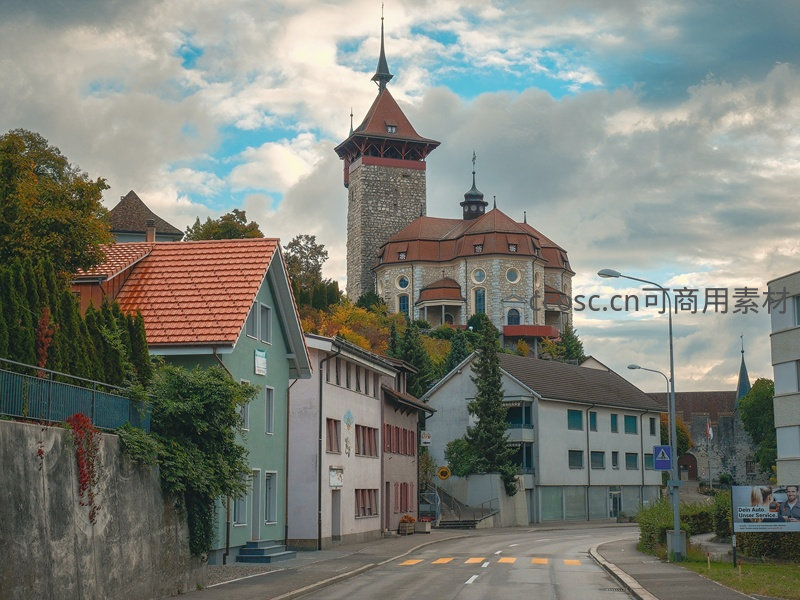 瑞士古城街景:石砌塔楼矗立坡顶,彩色民居与秋树相映成趣