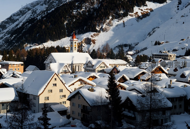 雪覆山村静谧安详,教堂尖塔耸立,冬日暖阳洒落