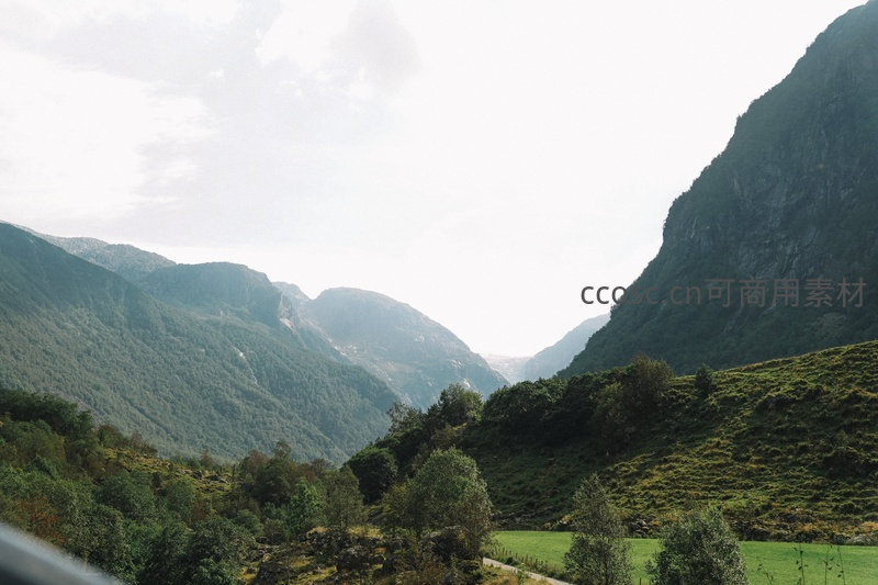 高处俯瞰挪威典型U型谷地貌:两侧陡峭青山覆盖浓密针阔混交林,谷底溪流旁分布翠绿牧场与零星农舍;远处冰川遗迹隐约可见,柔和日光斜照山脊,呈现生机盎然又宁静悠远的阿尔卑斯式田园画卷。