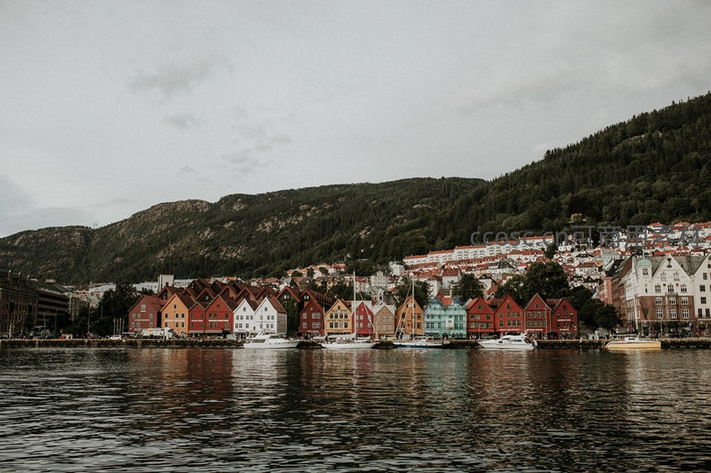 卑尔根布吕根码头彩色木屋群映水倒影,山城依坡而建