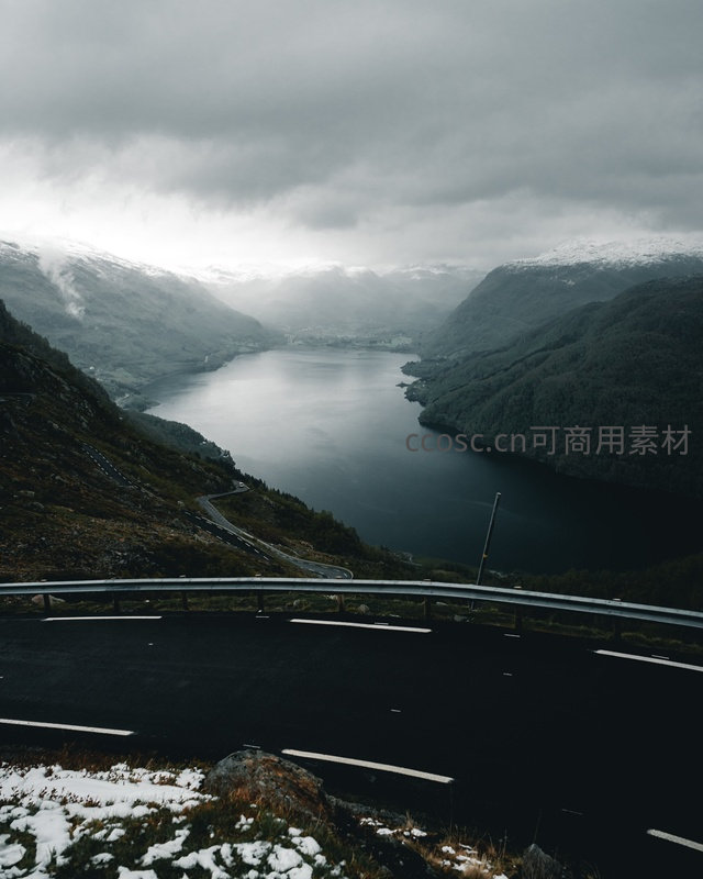 从高处俯拍盘山公路沿陡坡蜿蜒伸向幽深峡湾,路旁残雪未融,远山峰顶积雪皑皑,低垂云雾笼罩湖面与山谷,呈现北欧冬末春初清冷空灵的地理奇观与交通景观融合之美。