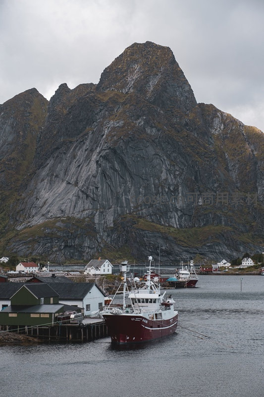 雷讷(Reine)渔村紧贴陡峭花岗岩山体,传统Rorbu小屋错落分布;一艘红色拖网渔船停靠木质码头,水面微漾倒影;阴云低垂下山体纹理清晰可见,展现斯堪的纳维亚渔民与险峻自然共存的坚韧日常。