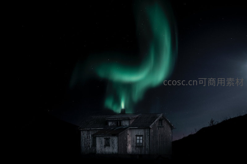 深邃夜空中绿色极光如丝带般流动飘逸,一幢老旧木屋轮廓在微光中若隐若现,屋顶烟囱隐约可见,星点闪烁,呈现人与自然共处的静谧诗意。